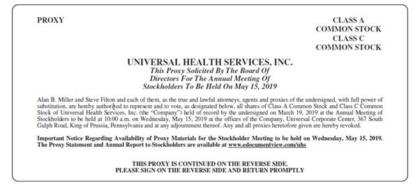 PROXY CLASS A COMMON STOCK CLASS C COMMON STOCK UNIVERSAL HEALTH SERVICES, INC. This Proxy Solicited By The Board Of Directors For The Annual Meeting Of Stockholders To Be Held On May 15, 2019 Alan B. Miller and Steve Filton and each of them, as the true and lawful attorneys, agents and proxies of the undersigned, with full power of substitution, are hereby authorized to represent and to vote, as designated below, all shares of Class A Common Stock and Class C Common Stock of Universal Health Services, Inc. (the “Company”) held of record by the undersigned on March 19, 2019 at the Annual Meeting of Stockholders to be held at 10:00 a.m. on Wednesday, May 15, 2019 at the offices of the Company, Universal Corporate Center, 367 South Gulph Road, King of Prussia, Pennsylvania and at any adjournment thereof. Any and all proxies heretofore given are hereby revoked. Important Notice Regarding Availability of Proxy Materials for the Stockholder Meeting to be held on Wednesday, May 15, 2019. The Proxy Statement and Annual Report to Stockholders are available at www.edocumentview.com/uhs THIS PROXY IS CONTINUED ON THE REVERSE SIDE. PLEASE SIGN ON THE REVERSE SIDE AND RETURN PROMPTLY