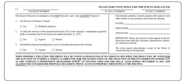 PLEASE MARK YOUR CHOICE LIKE THIS IN BLUE OR BLACK INK ‘ ACCOUNT NUMBER CLASS A COMMON CLASS C COMMON The Board of Directors recommends a vote FOR Proposals 1 and 2, and AGAINST Proposal 3: Discretionary authority is hereby granted with respect to such other matters as may properly come before the meeting. 1. The Election of Warren J. Nimetz DATED: ‘ For ‘ Withhold Authority SIGNATURE: 2. To ratify the selection of PricewaterhouseCoopers LLP, as the company’s independent registered SIGNATURE: public accounting firm for the fiscal year ending December 31, 2019. IMPORTANT: Please sign exactly as name appears at the left. ‘ For ‘ Against ‘ Abstain Each joint owner shall sign. Executors, administrators, trustees, etc. should give full title. 3. Stockholder proposal regarding proxy access if properly presented at the meeting. The above-signed acknowledges receipt of the Notice of ‘ For ‘ Against ‘ Abstain Annual Meeting of Stockholders. WHEN PROPERLY EXECUTED, THIS PROXY WILL BE VOTED AS DESIGNATED. IF NO CHOICE IS SPECIFIED, THE PROXY WILL BE VOTED FOR THE ELECTION OF WARREN J. NIMETZ AS DIRECTOR, FOR THE RATIFICATION OF THE SELECTION OF PRICEWATERHOUSECOOPERS LLP, AS THE COMPANY’S INDEPENDENT REGISTERED PUBLIC ACCOUNTING FIRM FOR THE FISCAL YEAR ENDING DECEMBER 31, 2019, AND AGAINST THE STOCKHOLDER PROPOSAL REGARDING PROXY ACCESS IF PROPERLY PRESENTED AT THE MEETING