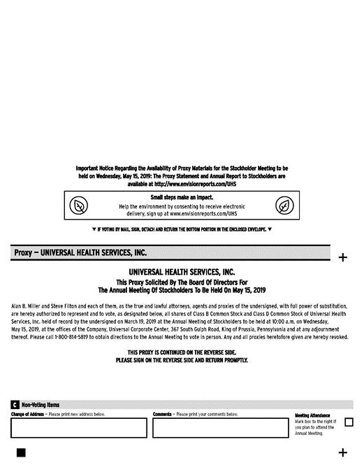 Important Notice Regarding the Availability of Proxy Materials for the Stockholder Meeting to be held on Wednesday, May 15, 2019: The Proxy Statement and Annual Report to Stockholders are available at http://www.envisionreports.com/UHS Small steps make an impact. Help the environment by consenting to receive electronic delivery, sign up at www.envisionreports.com/UHS • IF VOTING BY MAIL, SIGN, DETACH AND RETURN THE BOTTOM PORTION IN THE ENCLOSED ENVELOPE. • Proxy — UNIVERSAL HEALTH SERVICES, INC. + UNIVERSAL HEALTH SERVICES, INC. This Proxy Solicited By The Board Of Directors For The Annual Meeting Of Stockholders To Be Held On May 15, 2019 Alan B. Miller and Steve Filton and each of them, as the true and lawful attorneys, agents and proxies of the undersigned, with full power of substitution, are hereby authorized to represent and to vote, as designated below, all shares of Class B Common Stock and Class D Common Stock of Universal Health Services, Inc. held of record by the undersigned on March 19, 2019 at the Annual Meeting of Stockholders to be held at 10:00 a.m. on Wednesday, May 15, 2019, at the offices of the Company, Universal Corporate Center, 367 South Gulph Road, King of Prussia, Pennsylvania and at any adjournment thereof. Please call 1-800-814-5819 to obtain directions to the Annual Meeting to vote in person. Any and all proxies heretofore given are hereby revoked. THIS PROXY IS CONTINUED ON THE REVERSE SIDE. PLEASE SIGN ON THE REVERSE SIDE AND RETURN PROMPTLY. Non-Voting Items C Change of Address — Please print new address below. Comments — Please print your comments below. Meeting Attendance Mark box to the right if you plan to attend the Annual Meeting. +